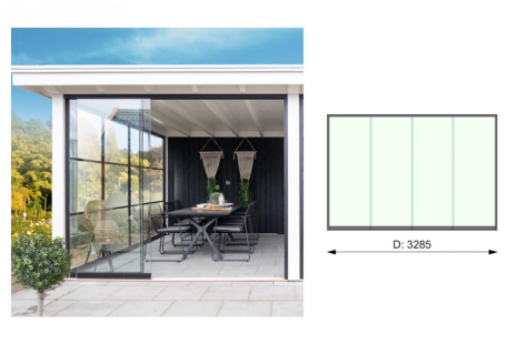 Glazen schuifwand D 328,5x224 cm incl verticale roedes 10mm dik glas, met meenemers, is een prachtige industriële schuifwand om langer plezier te hebben van uw buitenverblijf of overkapping. Deze wand heeft een stoere uitstraling en de verschillende delen worden als het ware voor de andere geschoven. De schuifwand is gemaakt van zwart gecoate verticale roedes van aluminium. Het glas bestaat uit 10mm dik glas en wordt geleverd incl. meenemers (links en rechts). Leverbaar in diverse afmetingen.