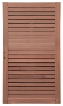 Keruing Modern poort 26 Rhombus met slot 100x180cm incl. aanslaglat staat voor een nieuwe, zeer moderne optiek in uw tuin. Deze hardhouten poort van 100% FSC is een prachtige tuindeur, zonder doorkijk voor uw tuin. Met de glad geschaafde latten van 6,5 cm hoog aan de voorzijde, die met een afstand van slechts 5 mm gemonteerd zijn, bereikt u een compact beeld. De poortdeur is mooi te combineren met de andere producten uit de Modern serie zoals Modern Scherm 51. Keruing is een mooie roodbruine hardhoutsoort met een levensduur van 10-15 jaar.